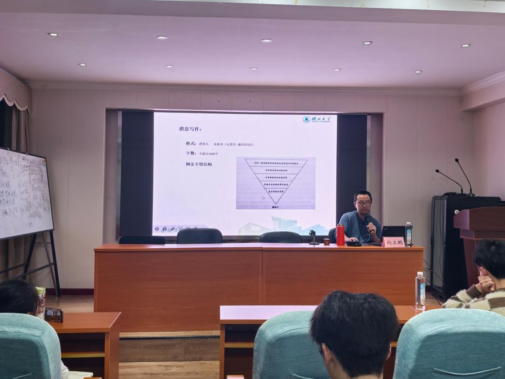 培训会上,向正鹏老师围绕“摄影技巧”与“消息稿写作”两大核心主题,进行了系统而深入的讲解。在摄影部分,他结合会议、调研、日常活动等多种宣传场景,从构图原理与光线运用入手,深入解析如何捕捉具有新闻价值的画面。在消息稿写作环节,向老师重点介绍了新闻写作的经典模式——“倒金字塔结构” ,即要做到开门见山、重点突出,确保稿件既符合专业规范,又便于读者快速获取关键信息。