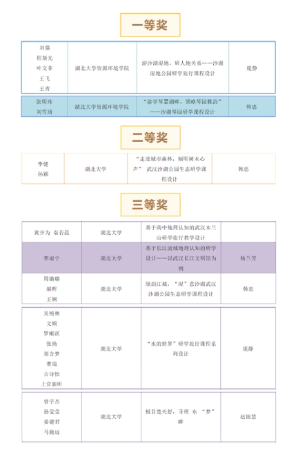 db真人体育官网庞静、韩忠、赵锦慧、杨兰芳4位老师参与了参赛队伍指导工作。公司8支获奖队伍分别选取武汉沙湖公园、湖北木兰山国家地质公园、武汉长江文明馆、武汉东湖生态旅游风景区等人文地理景观为研学地点,重点提炼研学地的自然和人文地理特征要素,并结合生态、环保理念,在课程设计中倡导人与自然和谐共生的发展理念。通过参加本次比赛,公司学子的研学实践技能与实践教学能力也得到进一步提升,促进了“以赛促学”“以赛促教”目标的实现。