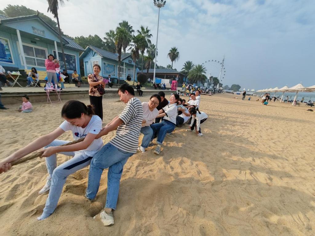 在湖面,教职工们体验了脚踏船的舒适、惬意。在沙滩浴场,教职工们按不同学科组队,进行了一场激动人心的拔河比赛。比赛中,老师们都咬紧牙关,倾尽全力,坚定信心,每一个人都充满力量与激情,每一次用力都让人热血沸腾,充分展现了团队合作的重要意义。