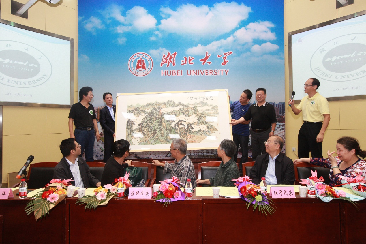 随后,员工代表们还将大家精心准备的礼物以及鲜花赠予当年的各位老师,铭谢师恩。在师生自由发言的环节,员工们纷纷回忆分享往昔求学与实习期间的趣事,共同回顾了在校学习和生活的点点滴滴,互相交流了自己目前的发展情况,表达了对母校、对昔日班集体的深厚感情,还通过写诗作词的方式表达了对老师的感谢之情。员工代表陈迪和还将自己精心创作的画作赠予公司,寓意“山常青,水长流,人常在,情常驻”,表达了对全体地理系83级员工们的美好祝愿。