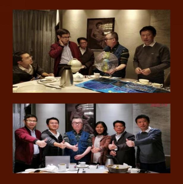 图为刘华新员工(右一)与同事一起商讨天球仪设计方案