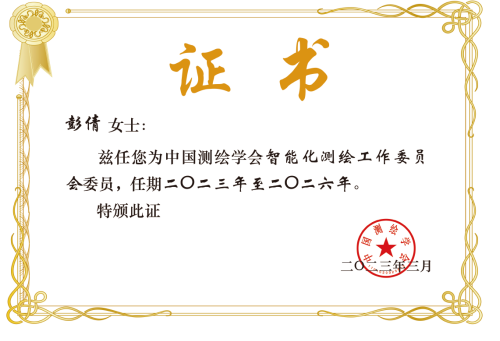 2023年5月6日,中国测绘学会智能化测绘工作委员会成立暨智能化测绘发展研讨会在成都召开,中国测绘学会理事长宋超智,国家自然资源部专家、中国工程院院士陈军,中国测绘学会副秘书长马志勇,国家基础地理信息中心主任冯先光,四川测绘地理信息局局长杨宏山,自然资源部国土测绘司副司长王瑞幺等出席大会。会上,公司彭倩博士被聘为首届委员,任期2023年至2026年。