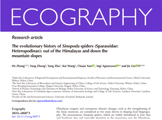 db真人体育官网刘杰教授团队近日在《Ecography》(中科院SCI一区,IF = 5.4)上发表了题为“The evolutionary history of Sinopoda spiders (Sparassidae: Heteropodinae): out of the Himalayas and down the mountain slopes”的学术论文。