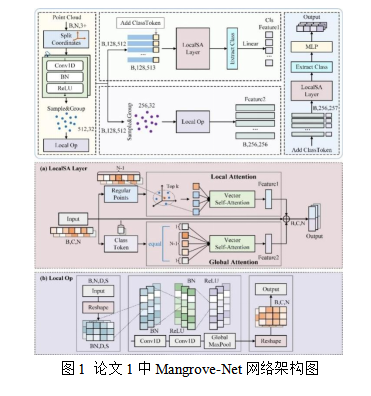 论文1题为“Mangrove-Net: A multi-stage attention fusion and class token network for mangrove species mapping using lidar point clouds”。针对红树林物种分类中,传统基于光栅化激光雷达数据的方法容易丢失精细三维结构信息、难以区分形态相似物种的难题,团队创新性地提出了一种专门针对红树林的点云深度学习物种分类网络——Mangrove-Net。该方法利用多阶段注意力融合和类标记(class token)机制,有效平衡了局部几何特征的表达与全局语义的感知。同时,研究引入了加权交叉熵损失函数,以应对样本不平衡的问题。在海南清澜省级自然保护区的验证测试中,该方法以75.26%的总精度(OA)和74.79%的平均类别精度(mAcc),显著优于PointNet++、Point Transformer、3DGTN等多种主流的点云深度学习基准模型。Mangrove-Net方法生成的红树林物种图具备更高空间连续性与生态一致性,且在ModelNet40数据集上验证了良好泛化能力。