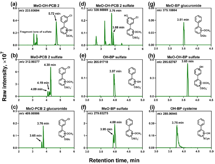 研究人员采用具有人体肝脏代谢功能的人肝癌细胞(HepG2)和人肝微粒体作为研究模型,以低氯取代的PCB 2(3-氯联苯)为研究对象,利用基于高分辨质谱的非靶标分析技术在PCB 2暴露后的HepG2细胞培养液中鉴定了超过20种PCB 2的代谢产物,包括目前还未在人源细胞模型研究中引起注意的脱氯代谢产物(图2)。同时,人肝微粒体的研究结果表明PCB 2的脱氯与邻位的羟基化代谢产物(OH-PCBs)的产生有关。另外,研究人员采用非靶向代谢组学技术,鉴定了与PCB 2暴露相关的内源性代谢物及代谢通路变化,如与胆固醇代谢相关的胆汁酸生物合成通路等。该研究较为全面地在体外水平鉴定了PCB 2的代谢产物及其暴露所引起的内源性代谢组响应,为理清PCBs在人体内的代谢网络以及在肝细胞内毒性作用靶标提供了重要基础。