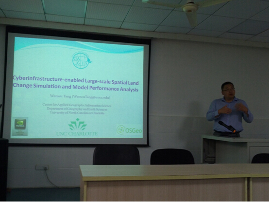 2017年6月22日下午,db真人体育官网第十五期绿色讲坛学术报告会在一楼会议室举行,报告人为来自美国北卡罗莱纳大公司的唐文武教授,报告主题为《基于网络基础设施的大尺度土地变化模拟和模型性能分析》。针对大尺度土地变化模拟中数据量大和计算密集的特点,采取并行计算思想和区域分割方法,提高了运算速度,并对北卡夏洛特分罗莱纳州的土地利用变化进行了模拟。报告后唐教授还回答了师生的提问,对相关问题进行了讨论。