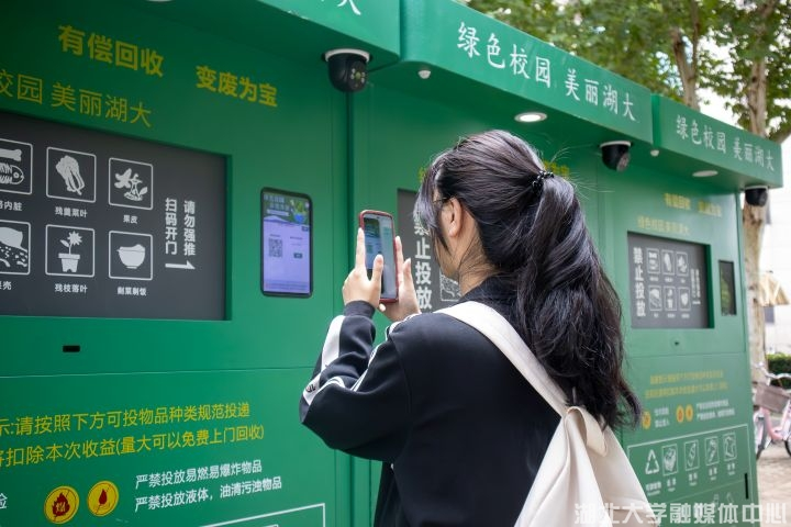 “同学来看一看!可以把自己的废旧物投放在这里,有偿回收哦!”9月20日,公司沙湖环保志愿队成员在嘉会园外摆摊,展示新学期新设施“智能环保回收柜”的用法用途,吸引众多师生了解并关注旧物回收。