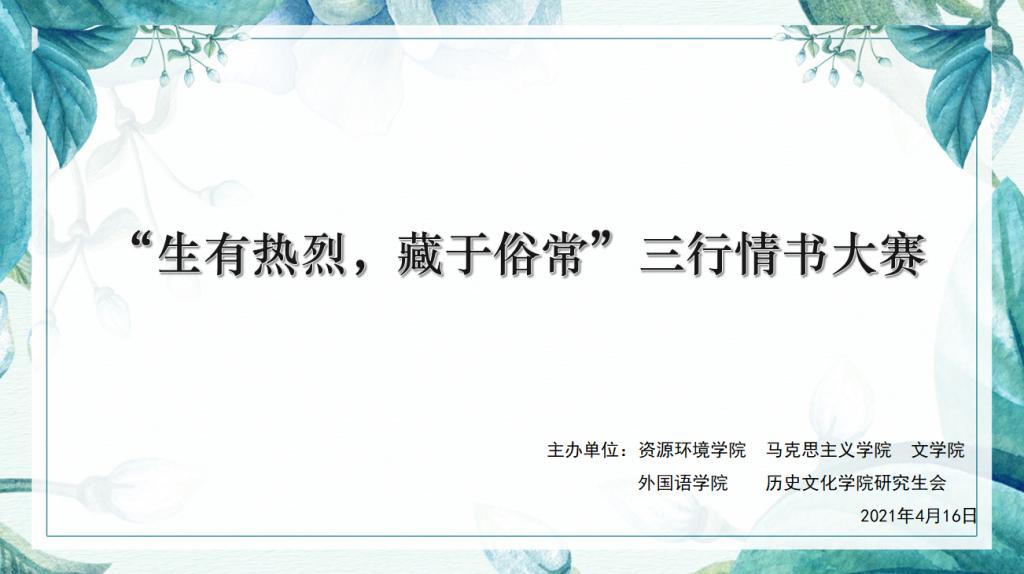 2021年4月16日晚上7点,“生有热烈,藏于俗藏”三行情书大赛决赛在文公司B6016顺利举行。本次大赛由db真人体育官网、马克思主义公司、文公司、外国语公司、历史文化公司5个公司共同举办。初赛大约有120人参加,最终每个公司5人进入决赛,共25人。决赛由db真人体育官网2020级研究生马营主持。