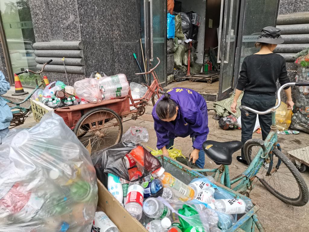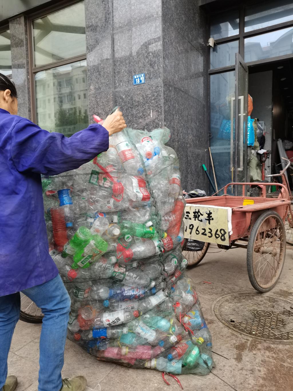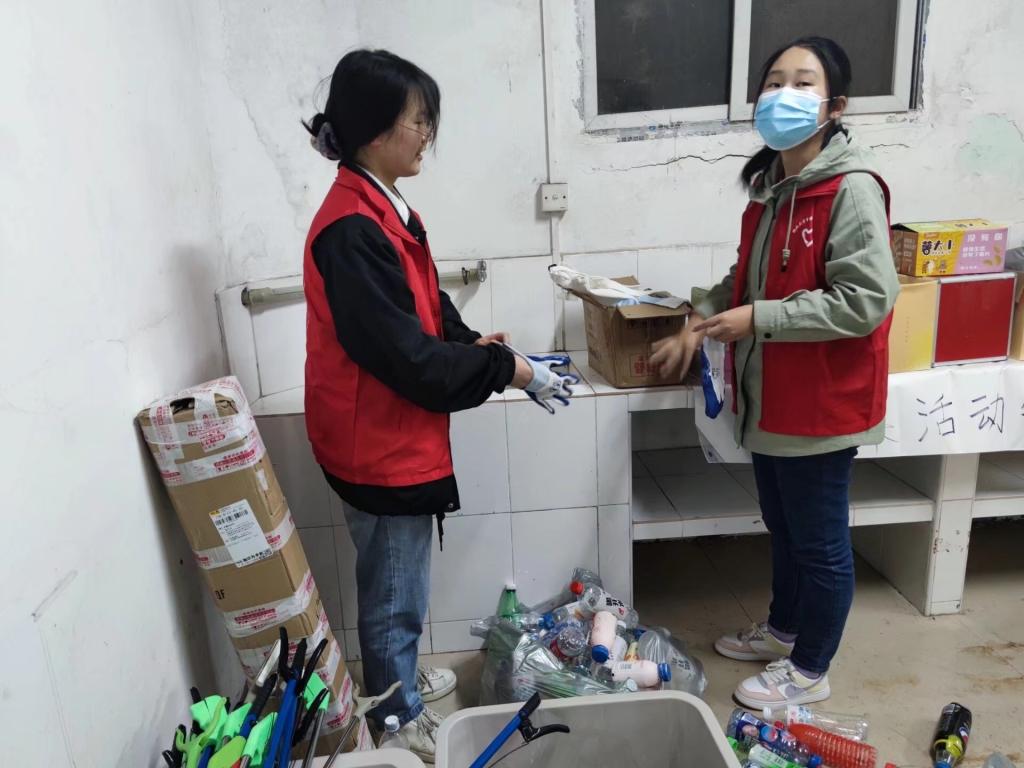 此次活动共有志愿者7人,其中三名志愿者负责地下室物品分类以及地面清洁,其他四名志愿者负责将饮料瓶从地下室搬到三轮车里,活动正有条不紊地进行。但是由于塑料瓶太多,塑料瓶清理至三分之二时,租来的两辆三轮车都被放满了,为了不耽误活动顺利进行,活动负责人立即联系志愿队其他成员帮忙租借了一辆三轮车,上午十点,志愿者们分成三组推着载满饮料瓶的三轮车,按照原定计划前往再生资源回收站。