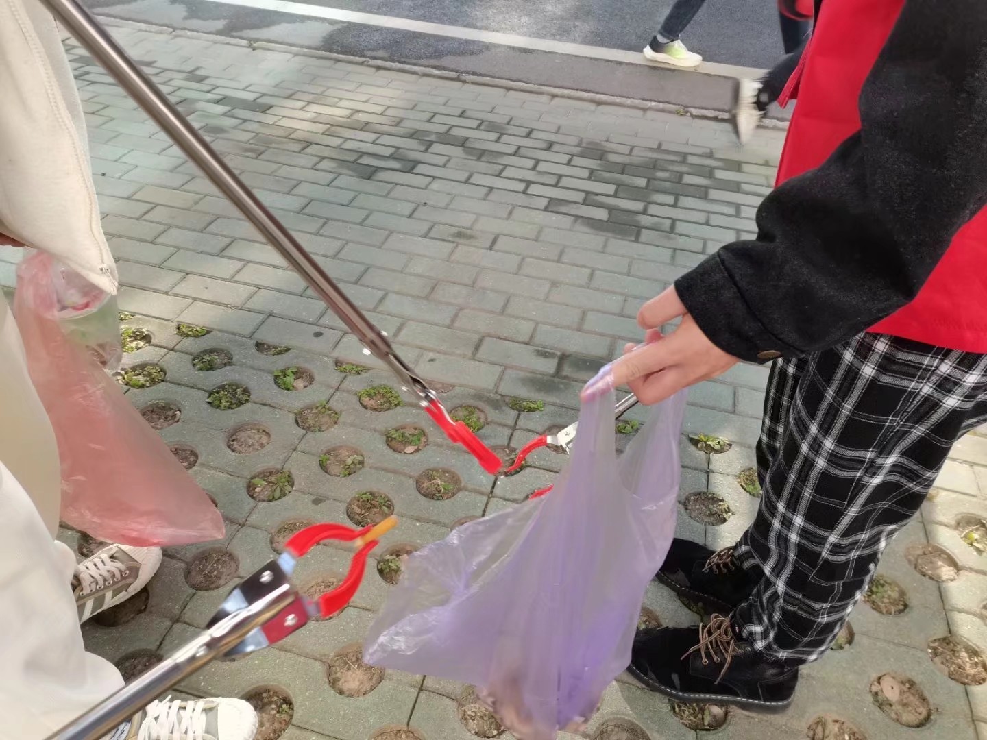 活动开始前,此次活动的两位负责人将活动志愿者三人一组分为六组,在给每位志愿者分发清理工具时,除了夹子以外,还给每组分发了三种不同颜色的垃圾袋,呼吁志愿者们将垃圾分类处理。上午九点,两位负责人各自带领三组志愿者,从db真人体育官网一楼出发,按照规划路线展开清洁。