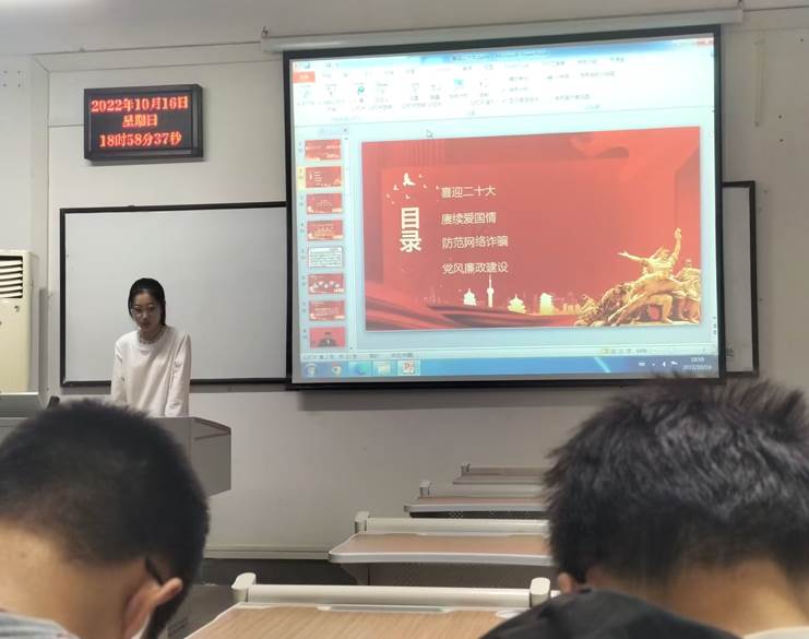 第一环节:学习二十大主题班会。团支书曹紫琴同学向大家介绍了本次中国共产党第二十次全国代表大会的举办流程及大会主题思想。